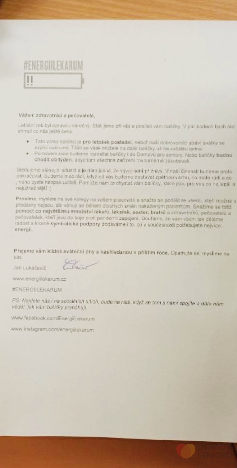 Domov seniorů Praha Vysočany › Články › Aktuality › Děkujeme Energii lékařům a firmě Resultatum, s.r.o.