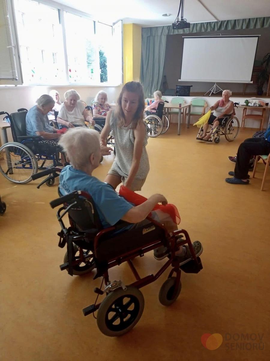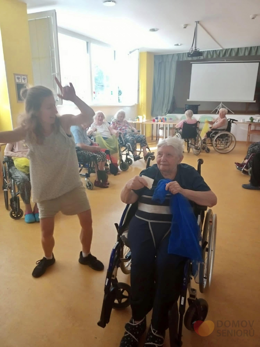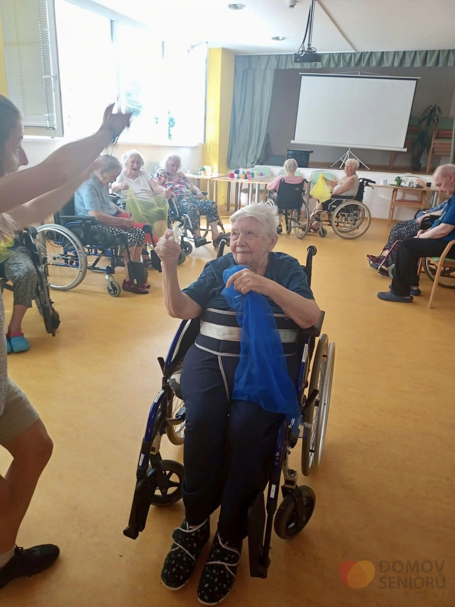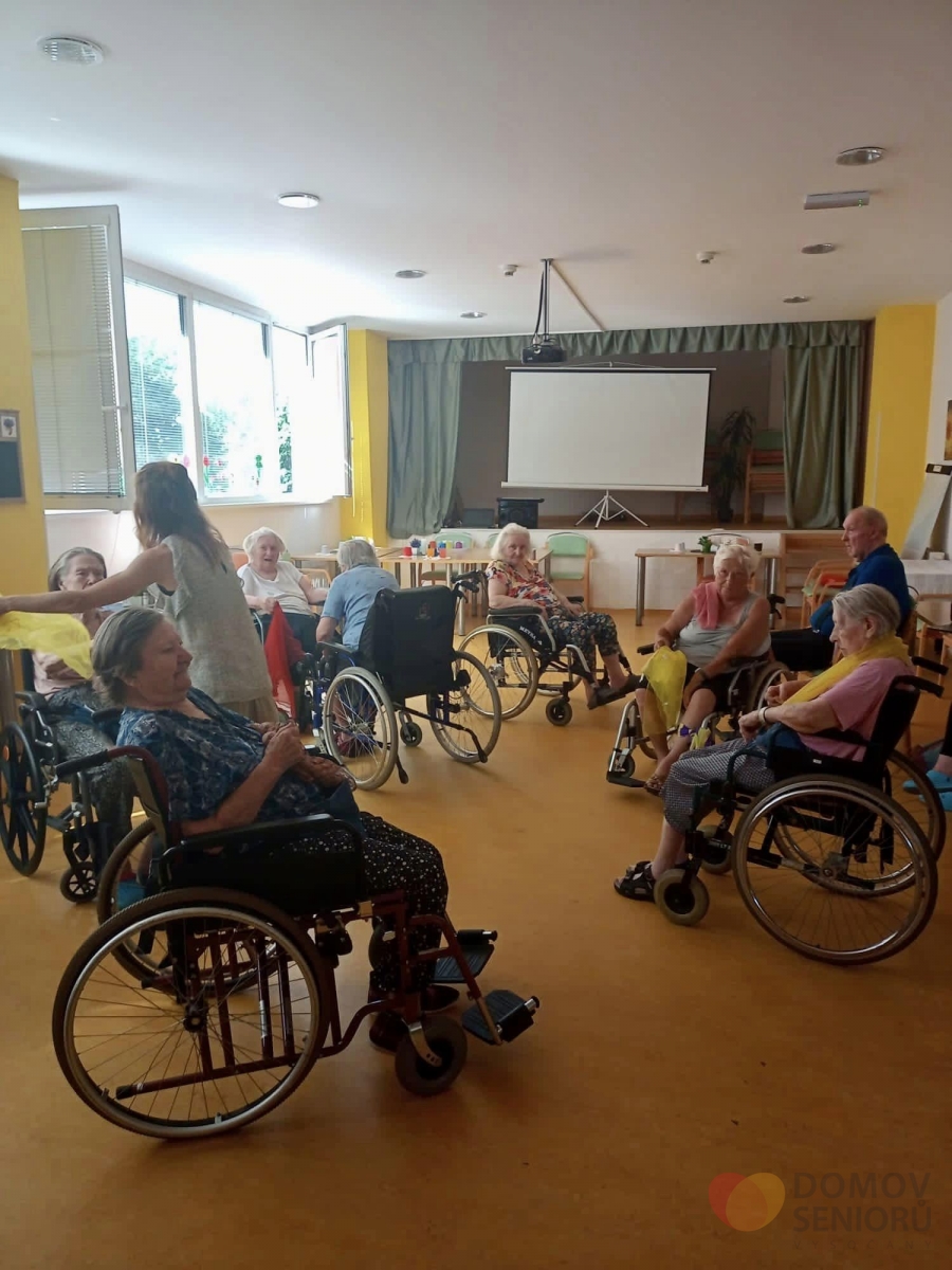 V srpnu nás opět navštívila paní Lucie, která se zabývá tanečně pohybovou terapií. Aktivita je zaměřena na rozhýbání, zábavu a sociální kontakt. Částečná imobilita není rozhodně překážkou! Tentokrát si Lucie připravila pro klienty šátky, se kterými vymyslela různé taneční kreace.