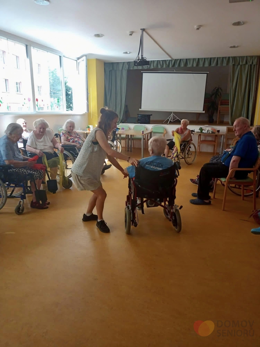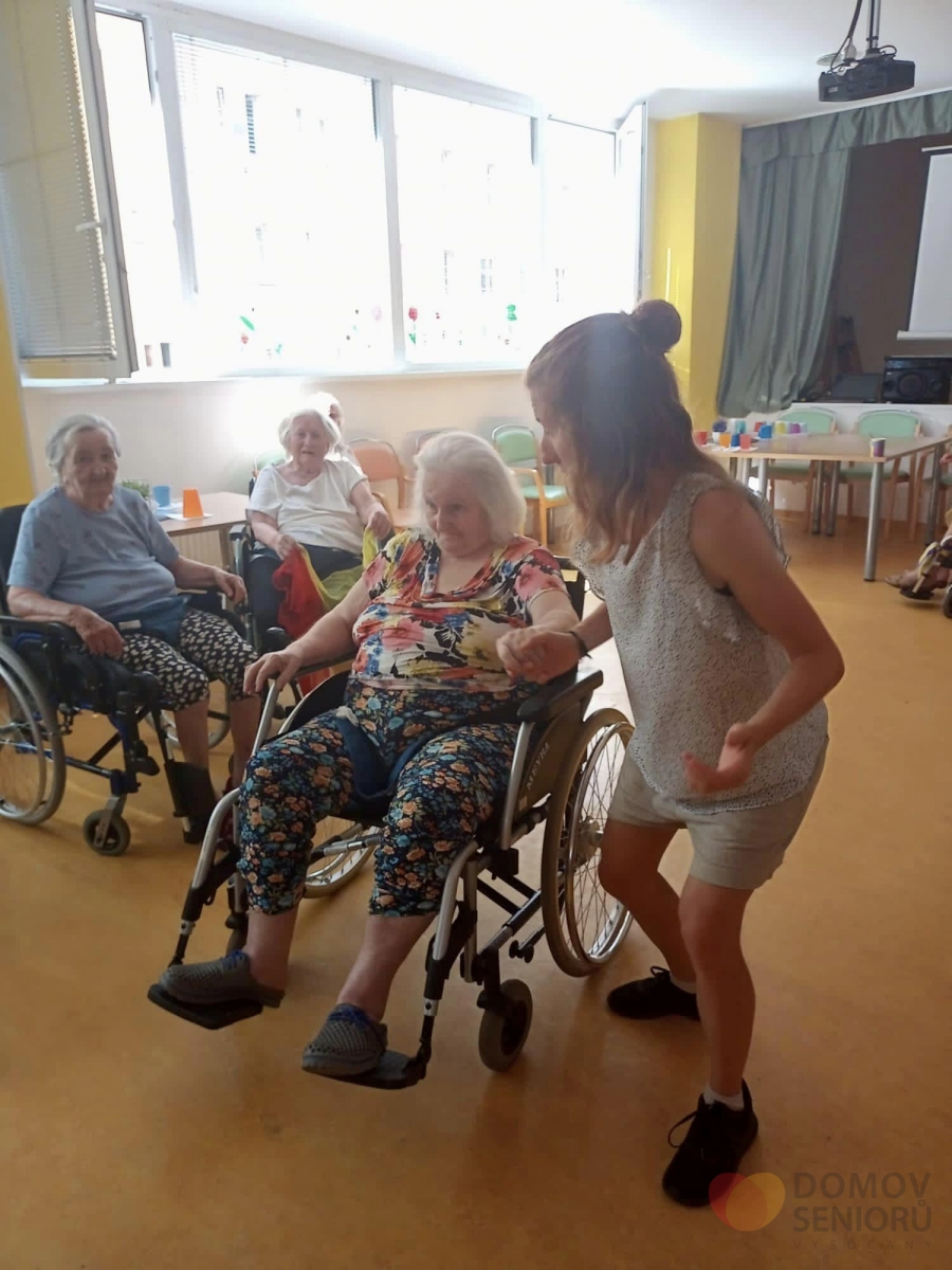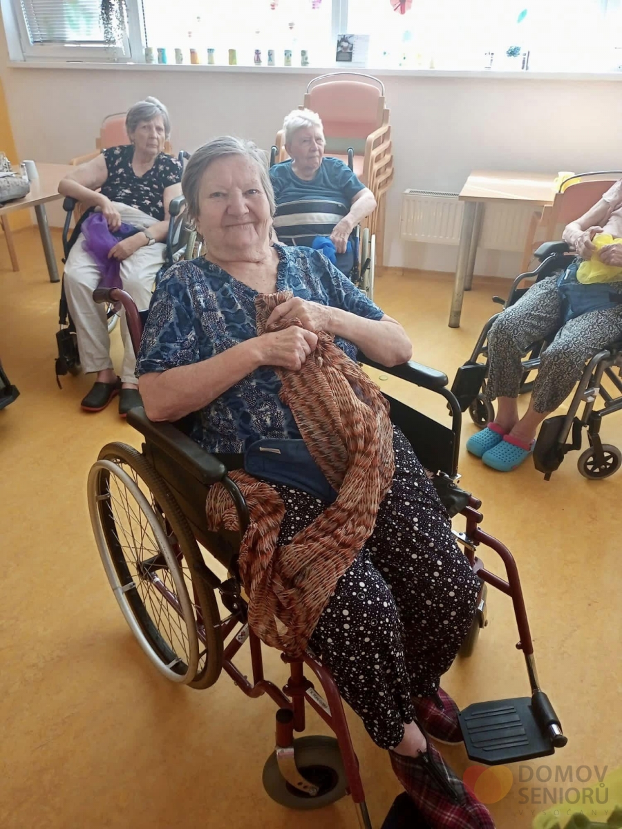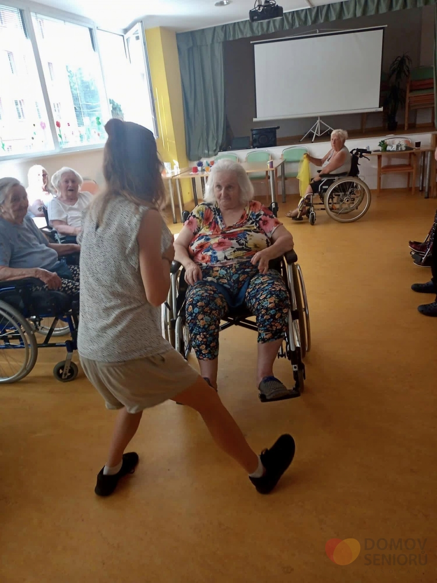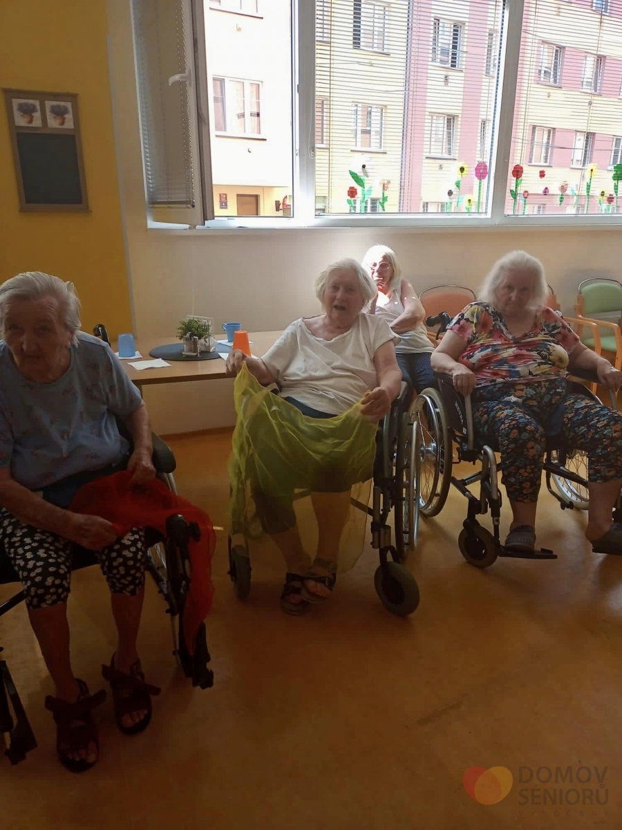 V srpnu nás opět navštívila paní Lucie, která se zabývá tanečně pohybovou terapií. Aktivita je zaměřena na rozhýbání, zábavu a sociální kontakt. Částečná imobilita není rozhodně překážkou! Tentokrát si Lucie připravila pro klienty šátky, se kterými vymyslela různé taneční kreace.