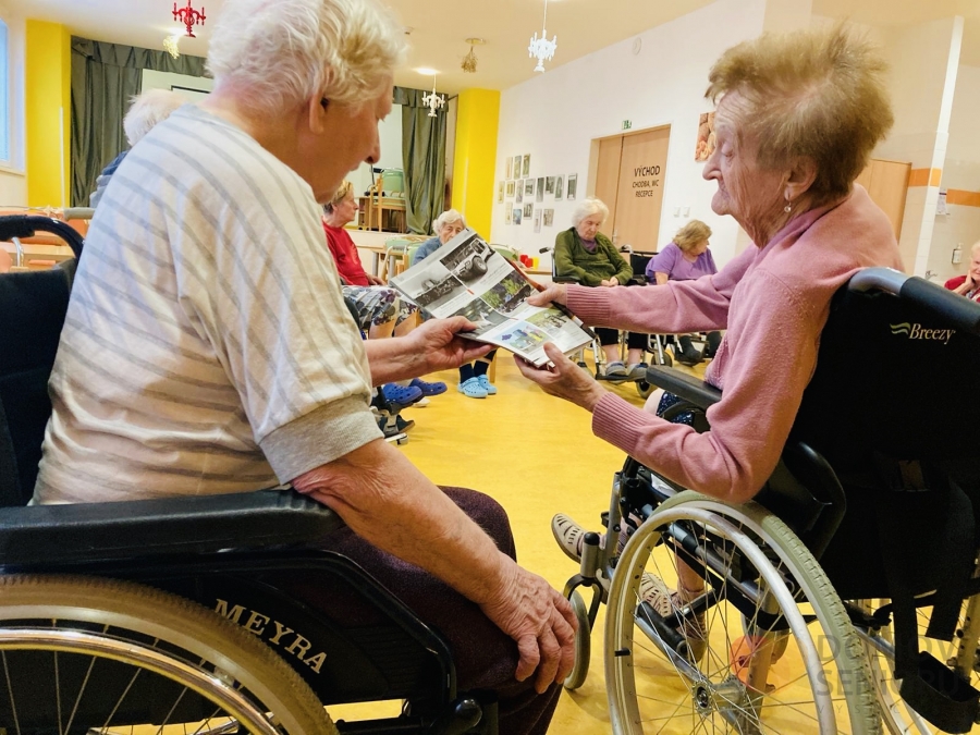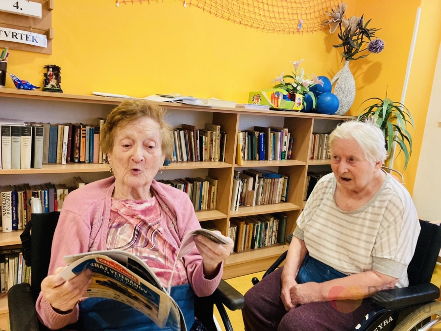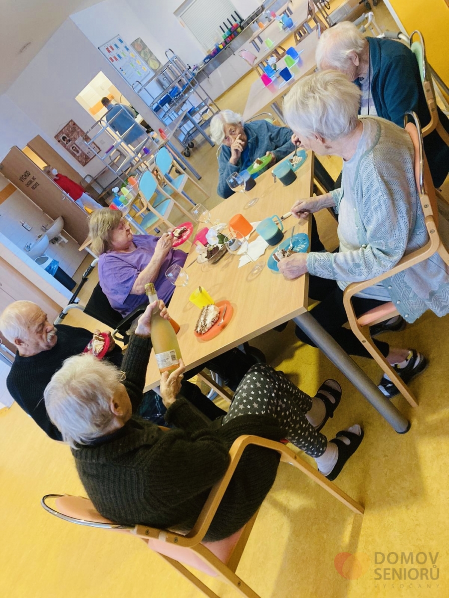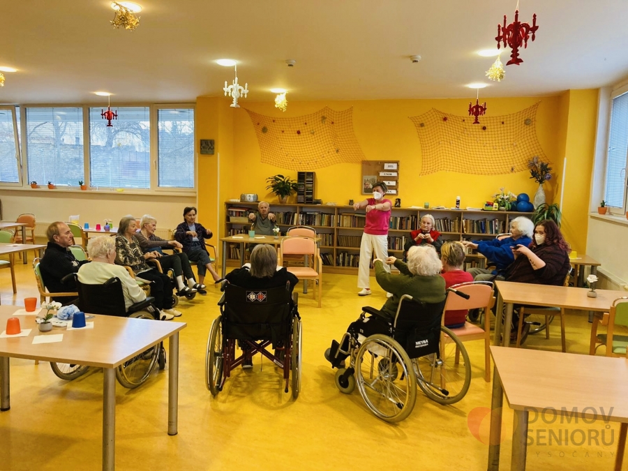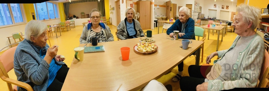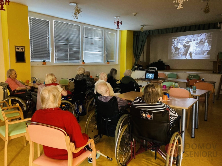 Naše aktivizační pracovnice dbají na to, aby klienti měli každý den zpestřený různými aktivitami. Níže se můžete podívat, jak probíhá náš den plný aktivit. Po ranní hygieně mají klienti snídani na jídelně nebo na pokoji. Poté je čeká rozvcička. Každý den si také povídáme o tom co se zrovna ve světě děje a přečteme si noviny. Následují individuální aktivity na pokojích klientů a skupinová aktivita ve společenské místnosti. Tentokrát jsme sledovali muzikální film v rámci filmového klubu. V rámci celého dne také probíhá indiviuální nebo skupinová rehabilitace našich klientů. Následuje oběd, polední klid a další skupinové a individuální aktivity. Např. společenské hry, jako je bingo nebo stolní hry. Nebo slavíme svátek či narozeniny. Tentokrát potěšila dortem i všechny ostatní naše klientka paní Libuška, která ten den oslavila krásných 84 let. Přejeme Vše nejlepší!