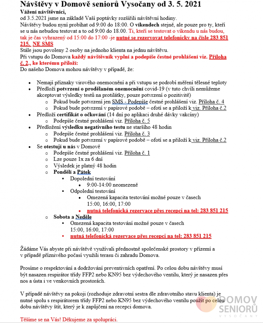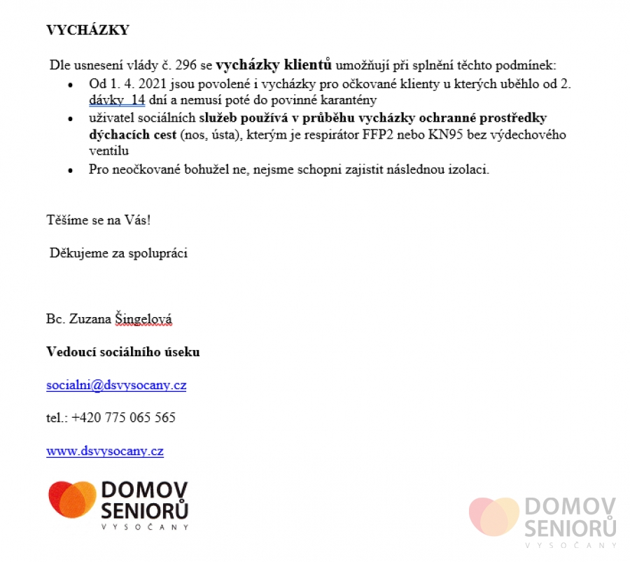 Domov seniorů Praha Vysočany › Články › Aktuality › NÁVŠTĚVY A VYCHÁZKY V DS VYSOČANY: změny od 3.5.2021