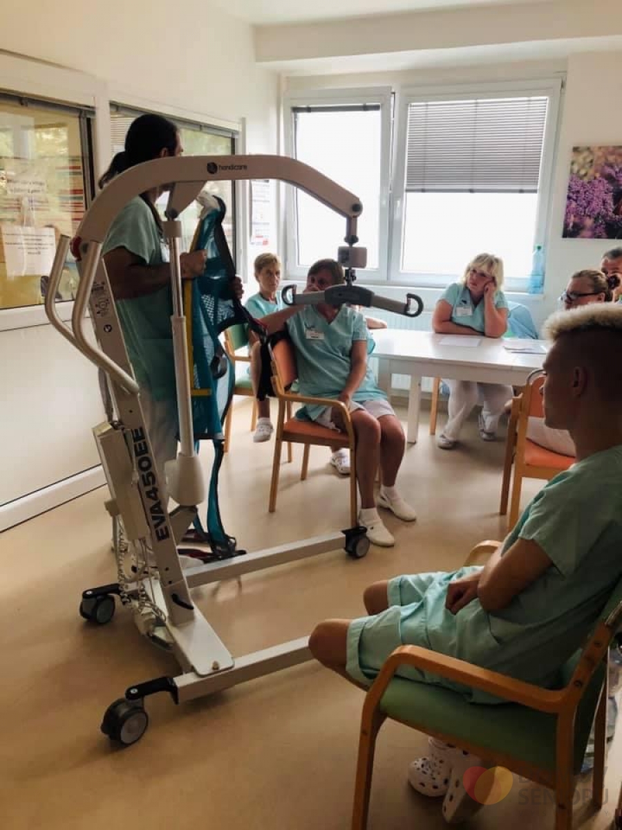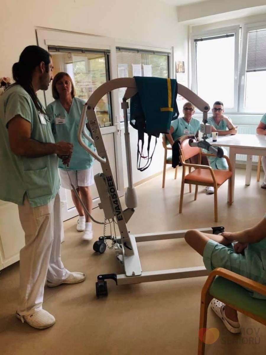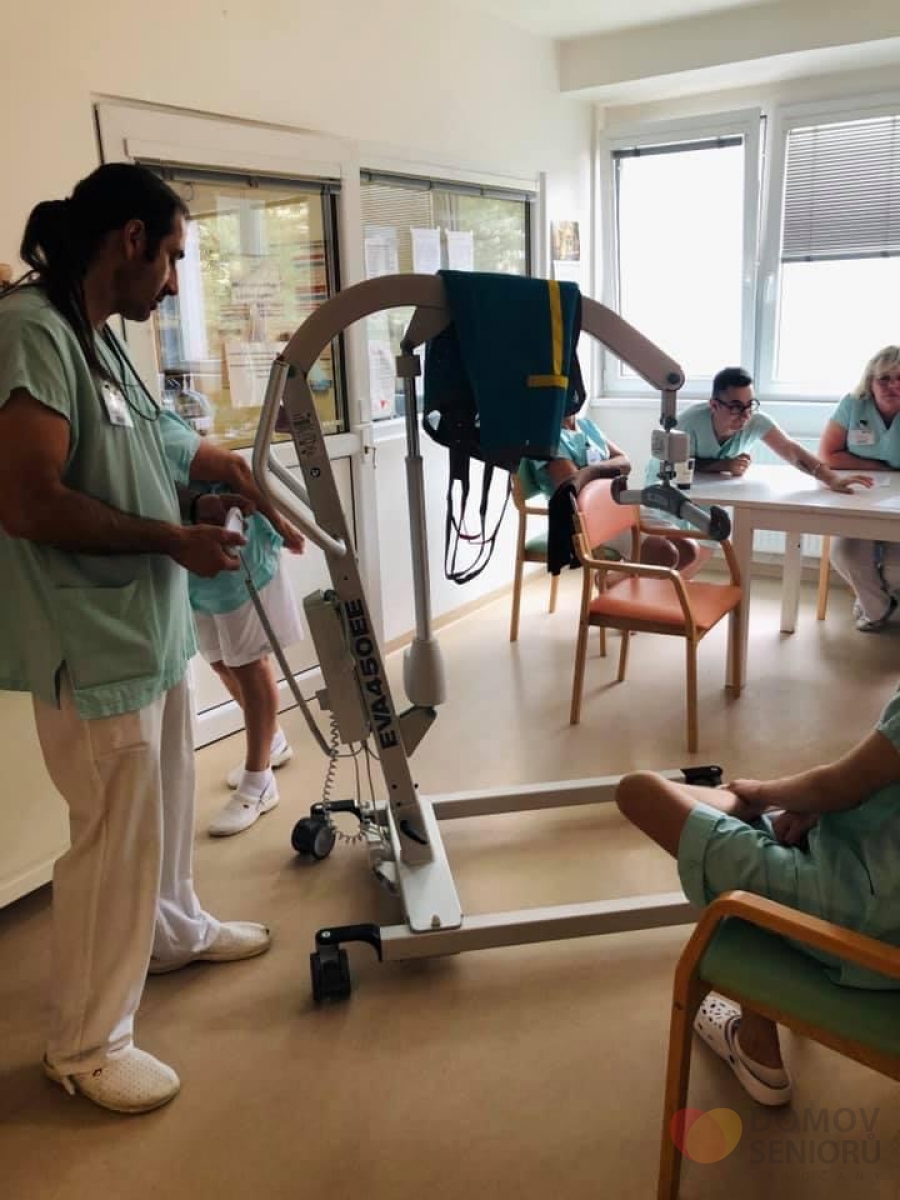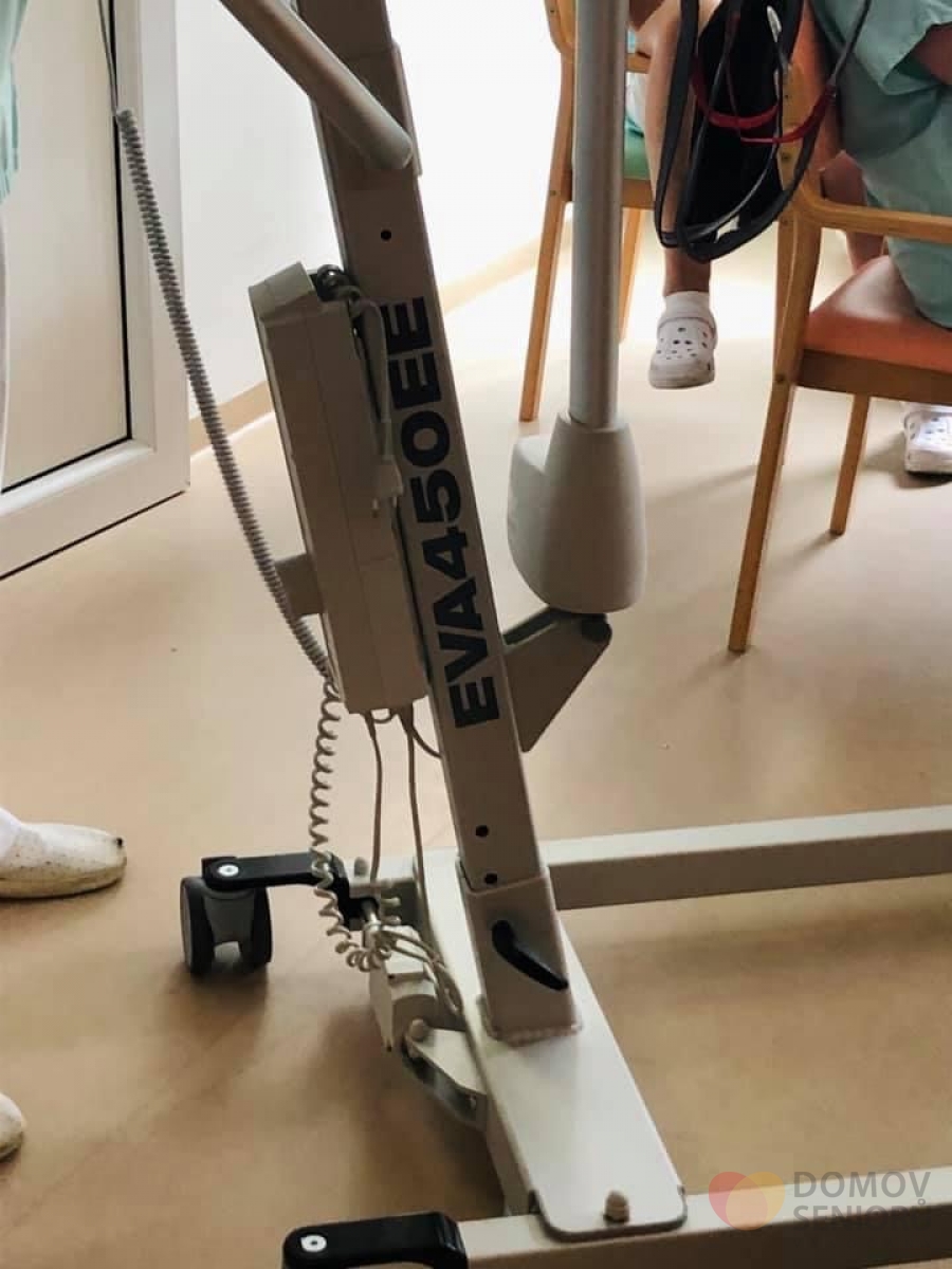 a stejně tak našich zaměstnanců je pro nás na prvním místě, pořídili jsme do našeho Domova nové, již třetí, zvedací zařízení, které umožní snadnější a hlavně bezpečnější manipulaci při péči o imobilní klienty. Slouží i k nácviku chůze a jeho součástí je váha.