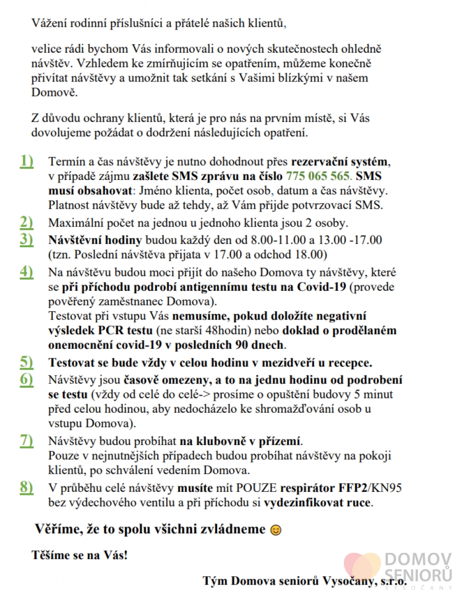 Vzhledem ke zmírňujícím se opatřením, můžeme konečně přivítat návštěvy a umožnit tak setkání s Vašimi blízkými v našem Domově.