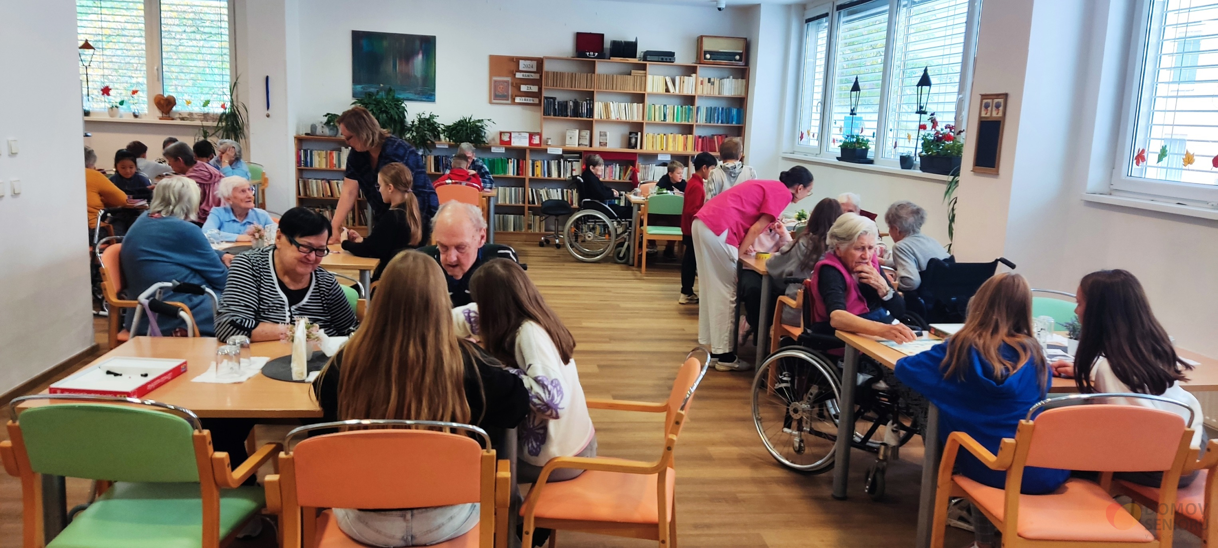 "PŮLKULATINY. Již pátým školním rokem vedeme u nás projekt OBEJMI, v němž propojujeme zcela dvě odlišné generace lidí. Učíme tím vzájemnému porozumění. Máme radost, že se projektu daří!