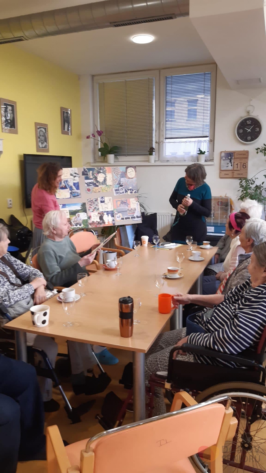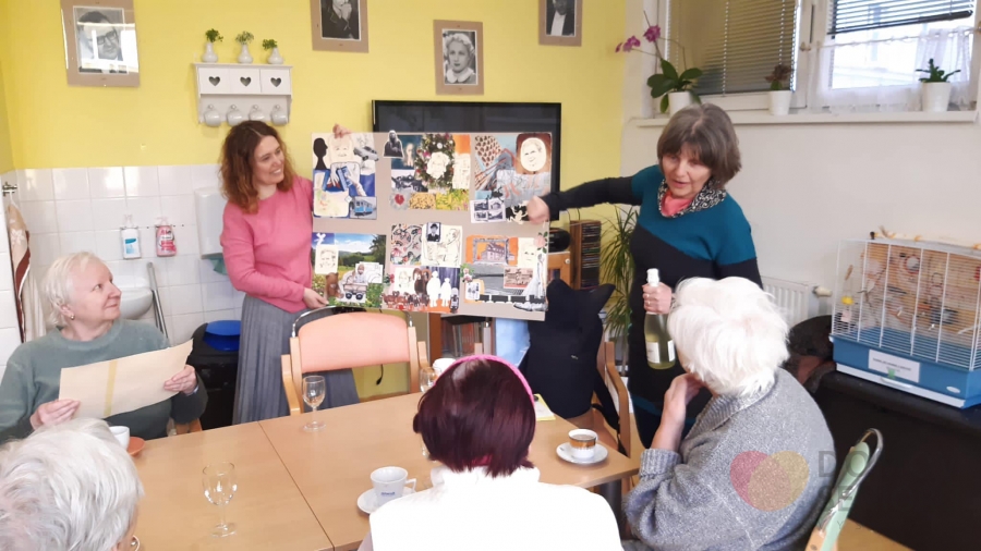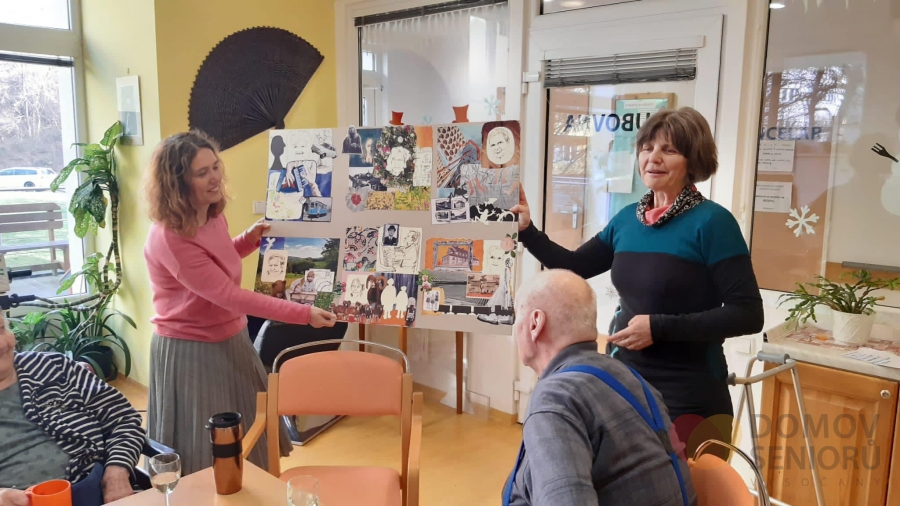 Od minulého roku u nás proběhlo několik setkání v rámci reminiscence od sociálně aktivizační služby Lifetool (Diakonie). Klienti spolu s pracovnicemi služby prohlíželi fotografie, dobové filmy či různé přeměty a přitom vzpomínaly, jak se dříve žilo, na jejich dětství a školu. Ze vzpomínek se poté společně vytvořila koláž, která nyní visí u nás v