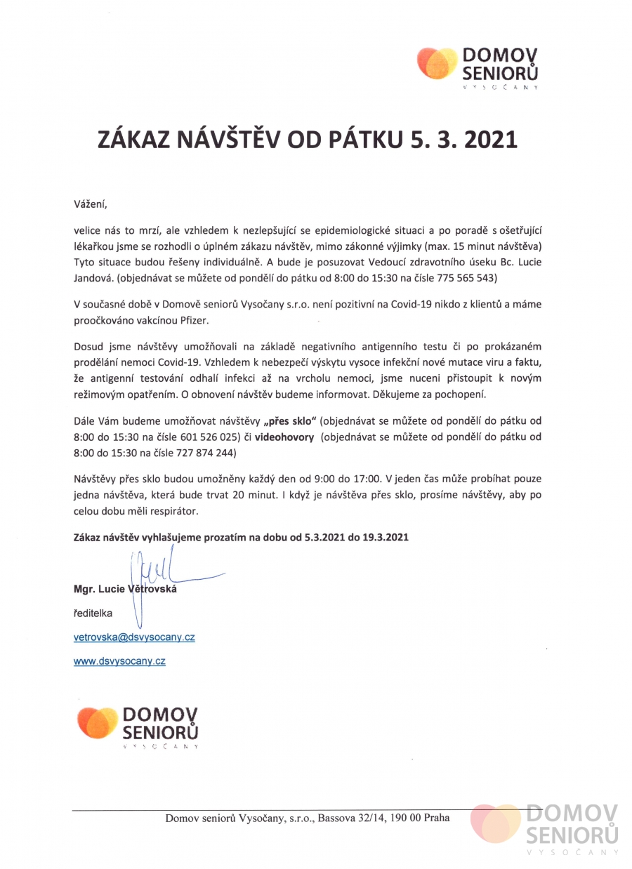 Domov seniorů Praha Vysočany › Články › Aktuality › Zákaz návštěv od 5.3.2021