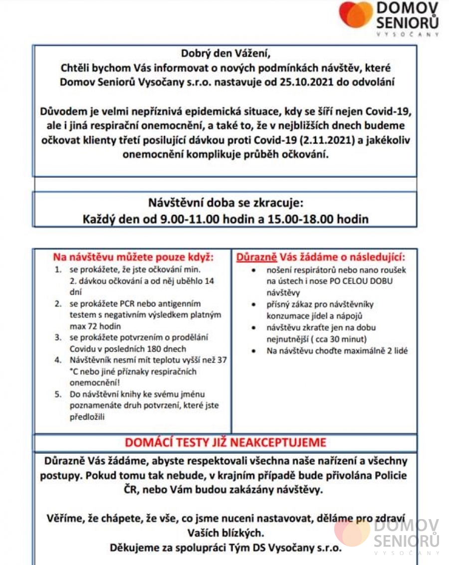 Domov seniorů Praha Vysočany › Články › Aktuality › Změna návštěv od 25.10.2021