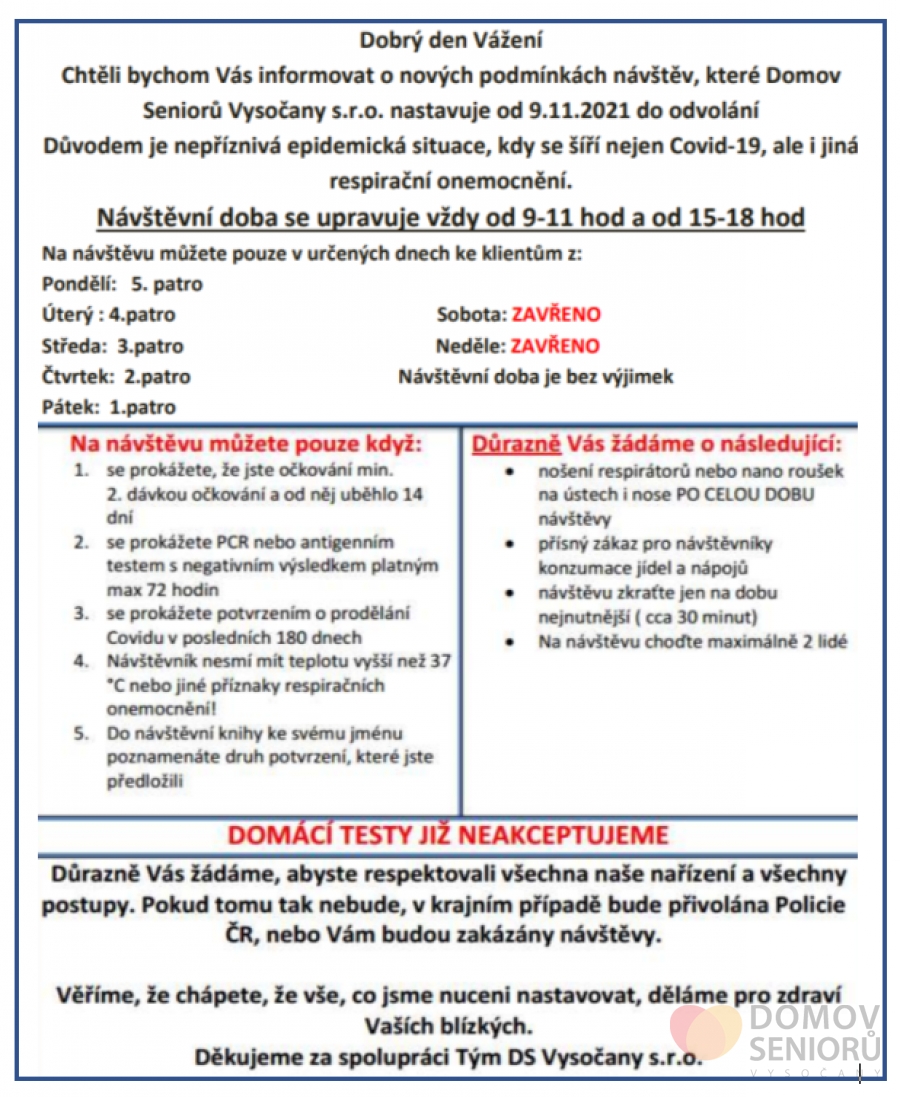 Domov seniorů Praha Vysočany › Články › Aktuality › Změna návštěv od 9.11.2021